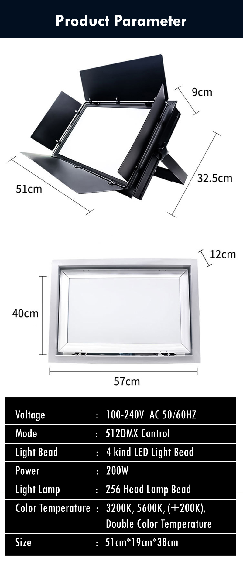 • 200W Size - 51*19*38cm (256 LEDs)